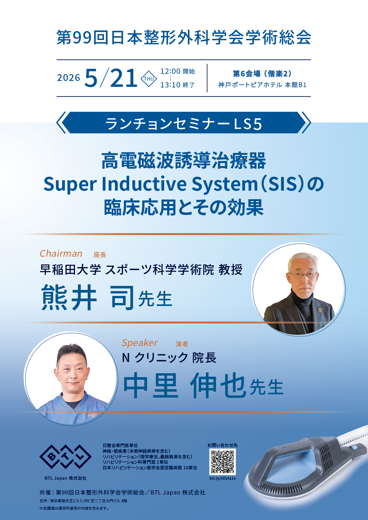 第99回日本整形外科学会学術総会 ランチョンセミナー LS5 2026.03.06 高電磁波誘導治療器 Super Inductive System(SIS)の臨床応用とその効果 イベント日程 2026 05 21 Thu 2026 05 21 Thu